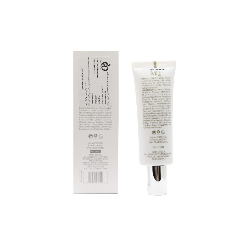 ترکیبات مفیدی که در این کرم استفاده شده است، حاوی خاصیت ضد میکروبی نیز میباشند و از جذب رادیکالهای آزاد و انواع آلودگی مخرب، توسط پوست جلوگیری مینماید. کرم ضد آفتاب فاقد چربی SPF 50 ام کیو (فاقد رنگ)، میزان ترشح چربی پوست را تنظیم میکند و به تعادل میرساند و دارای خاصیت مات کنندگی است و از براقیت حاصل از چربی پوست میکاهد. با استفاده از این کرم، از ایجاد مجدد جوش و آکنه بر روی پوست پیشگیری خواهد شد. کرم ضد آفتاب فاقد چربی SPF 50 ام کیو ، در برابر آب و تعریق مقاوم است و از ماندگاری بالایی برخوردار میباشد. ام کیو این محصول خود را در چهار رنگ صورتی، بژ طبیعی، بژ روشن و بی رنگ ارائه نموده است که افراد میتوانند متناسب با رنگ پوست خود از این کرمها استفاده نمایند. کیفیت کرم ضد آفتاب فاقد چربی SPF 50 ام کیو ، بسیار بالا می باشد و خواهد توانست به خوبی پوست را به طور کامل و به صورت یکدست پوشش دهد.