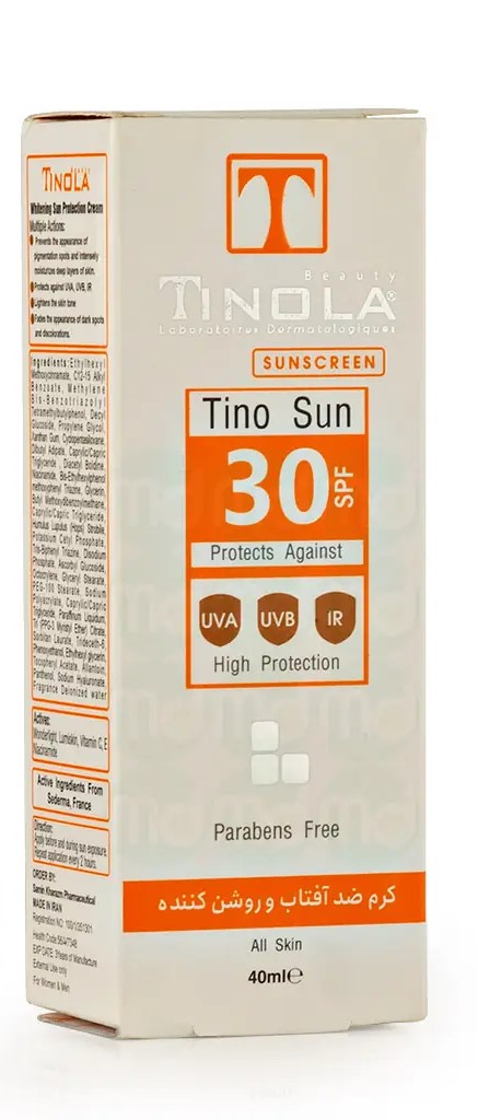 کرم ضد آفتاب و روشن کننده تینولا با داشتن نیاسینامید به مهار آنزیم تیروزیناز کمک کرده و برای درمان لک های صورت بسیار کار آمد می باشد. این کرم ضد آفتاب از پوست در برابر اشعه های UV محافظت کرده و از ایجاد لک و تیرگی بر روی پوست پیشگیری می کند. کرم ضد آفتاب و روشن کننده تینولا یک آنتی اکسیدان قوی بوده و دارای خاصیت روشن کنندگی می باشد. استفاده روزانه این کرم از بروز علائم پیری زودرس پوست و آفتاب سوختگی در اثر قرار گرفتن در معرض آفتاب جلوگیری کرده و مانع از آسیب رسیدن به پوست می شود. این محصول دوکاره می تواند عوارض های پوستی را به حداقل برساند.