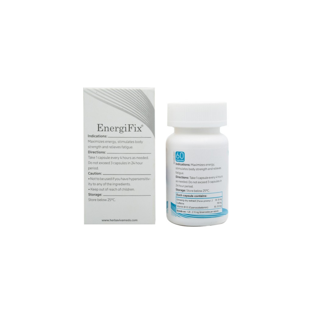 کپسول انرژیفیکس هرباویوا، یکی از داروهای گیاهی بوده که از عصاره گیاه جینسینگ، کافئین و ویتامین ب12 ساختهشده و بهعنوان یک ماده انرزیزا مورد استفاده قرار میگیرد. این دارو قادر است تا خستگی جسمی و ذهنی را برطرف کرده و درنتیجه قوای جسمی و ذهنی فرد را ارتقا میبخشد.