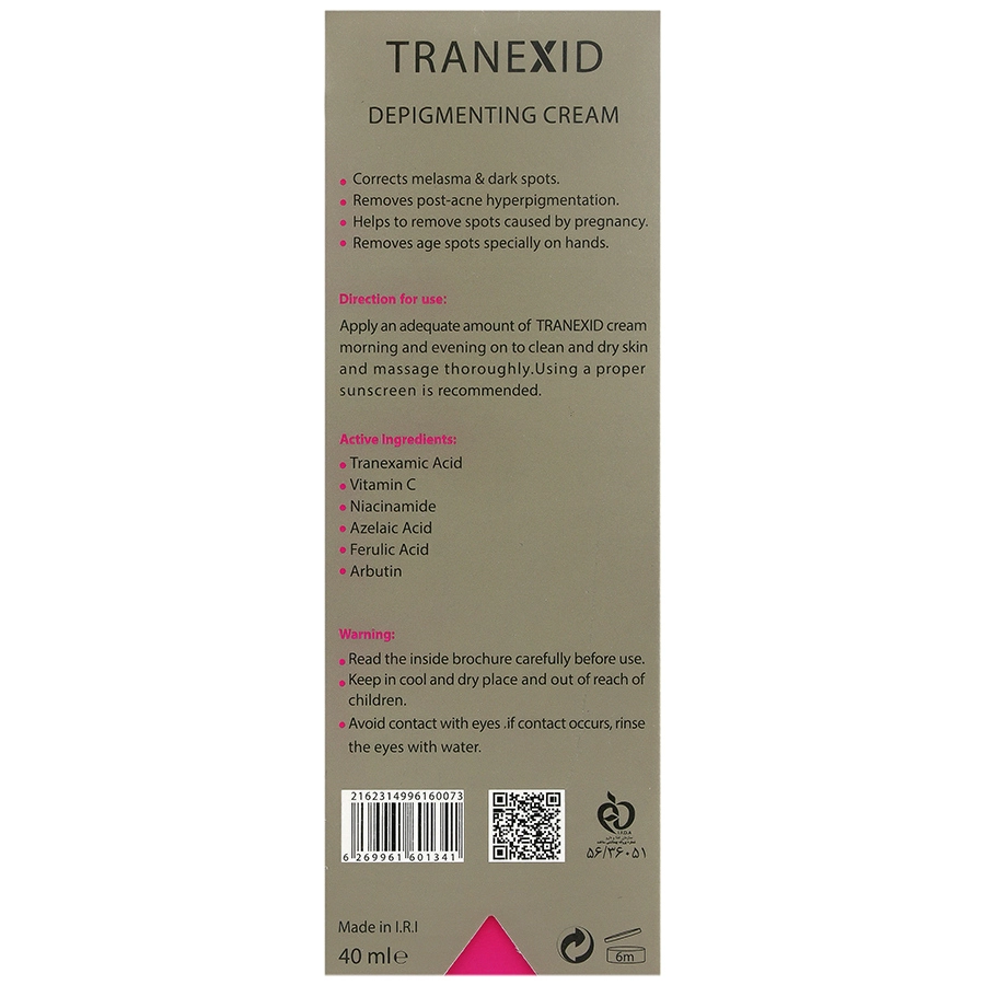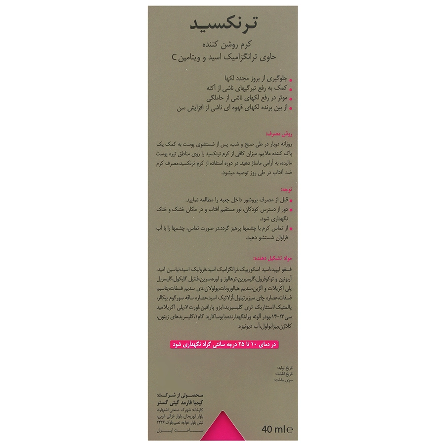کرم روشن کننده ترنکسید درمالیفت دارای مواد موثره ویتامین سی با قدرت روشن کنندگی است که علاوه بر تغییر رنگ پوست، با خواص فوق العاده خود، مانع از بروز مجدد لک های پوستی می شود.کرم ترنکسید با بهره گیری از خواص ترانگزامیک اسید در بهبود ظاهر رنگدانه های پوست اثربخش است و به کاهش لک های قهوه ای ناشی از افزایش سن کمک می کند.