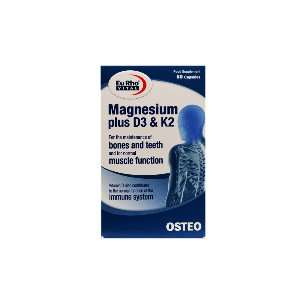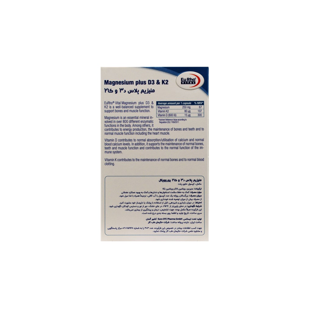 کپسول منیزیم پلاس در و کا۲ یوروویتال حاوی ۲۵۰ میلی گرم زینک (روی) به همراه ویتامین های کا۲ و د۳ می باشد که موارد مصرف آن بهبود سلامت استخوان ها، بهبود عملکرد عضلات و جلوگیری از گرفتگی آن ها و افزایش سطح انرژی می باشد.