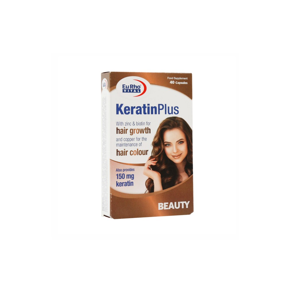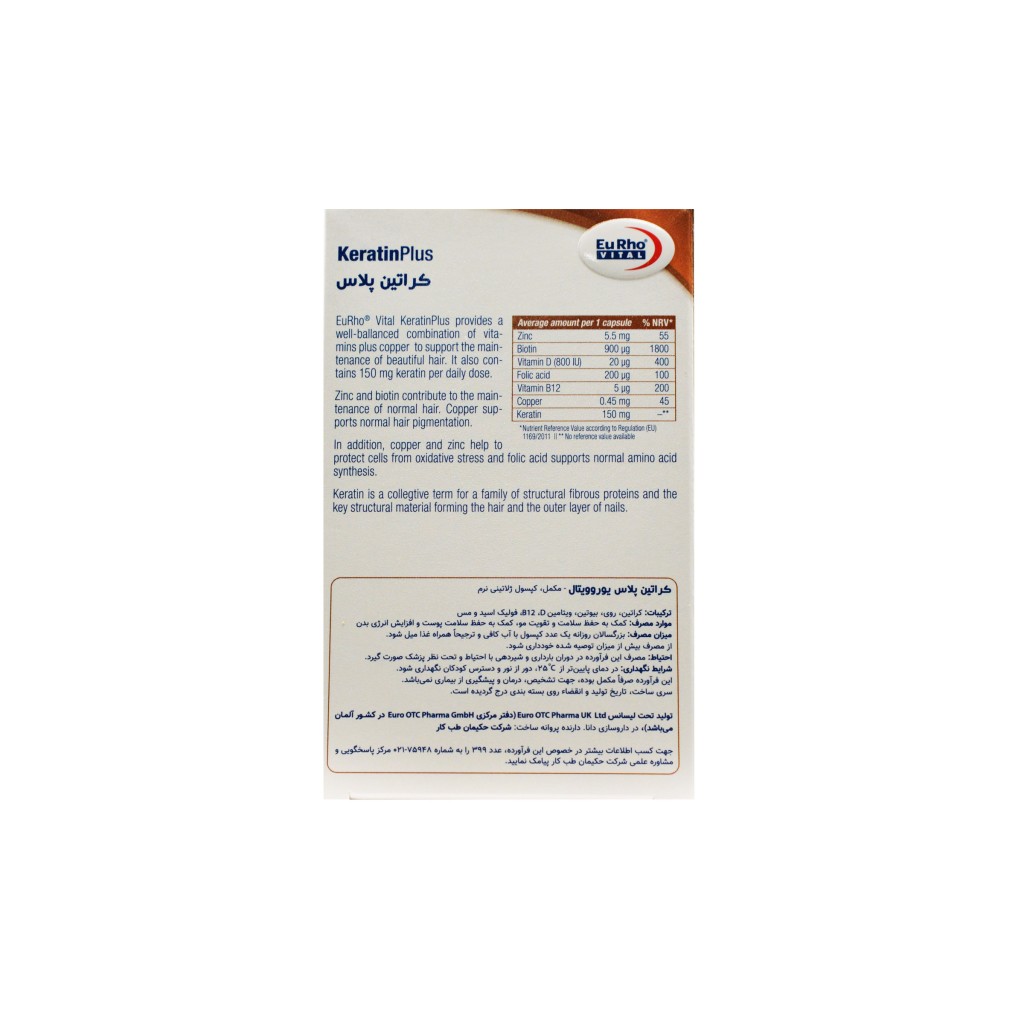 کپسول کراتین پلاس یوروویتال حاوی کراتین، بیوتین، روی، مس، اسید فولیک، ویتامین D و B12 برای جلوگیری از ریزش مو، تقویت ناخن ها و بهبود ساختار و محافظت از مو و ناخن است. در زیر تاثیر استفاده از هر یک از این ترکیبات را جداگانه توضیح خواهیم داد.