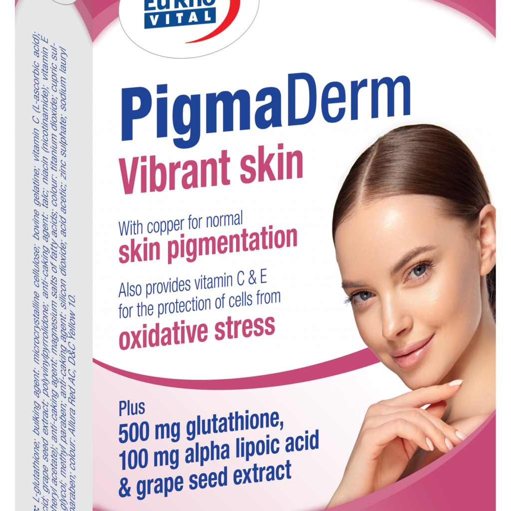 عوامل مختلفی از جمله اشعه ماورا بنفش خورشید، افزایش سن، استرس و مصرف غذاهای ناسالم و فرآوری شده باعث تیره شدن پوست، بروز لکها و چین و چروکهای پوستی میشود. ترکیبات آنتیاکسیدانی به روشن شدن پوست، از بین رفتن لکهای پوستی و ترمیم پوست کمک میکنند. کپسول پیگمادرم یوروویتال حاوی ال-گلوتاتیون، عصاره هسته انگور، آلفا لیپوئیک اسید، ویتامینهای E و C، نیاسین و مس است که اثرات مثبتی در شادابی و سلامت پوست، مو و ناخن دارد.