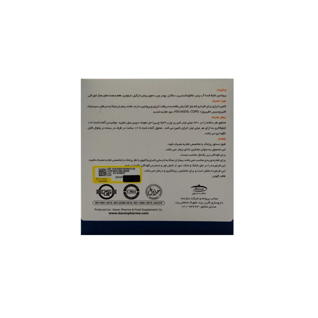 پودر پر کالری کارن (7 عددی)، یکی از فرآوردههای مکملی است که برای دورههای شیمی درمانی و رادیوتراپی مناسب و مفید میباشد. این پودر کالری بالای داشته و برای افرادی که بسیار در معرض سو تغذیه قرار دارند، مفید میباشد. مبتلایان به بیماری ایدز، سرطان، سیستیک فیبروزیس و یا انسدادیهای شدید ریه هم میتوانند از این پودر یا مکمل برای رفع نیازهای بدن خود استفاده کنند. این مکمل حاوی روغنهای اومگا 3، اومگا6 و اومگا 9 بوده و سیستم گوارشی فرد را بهبود میبخشد.