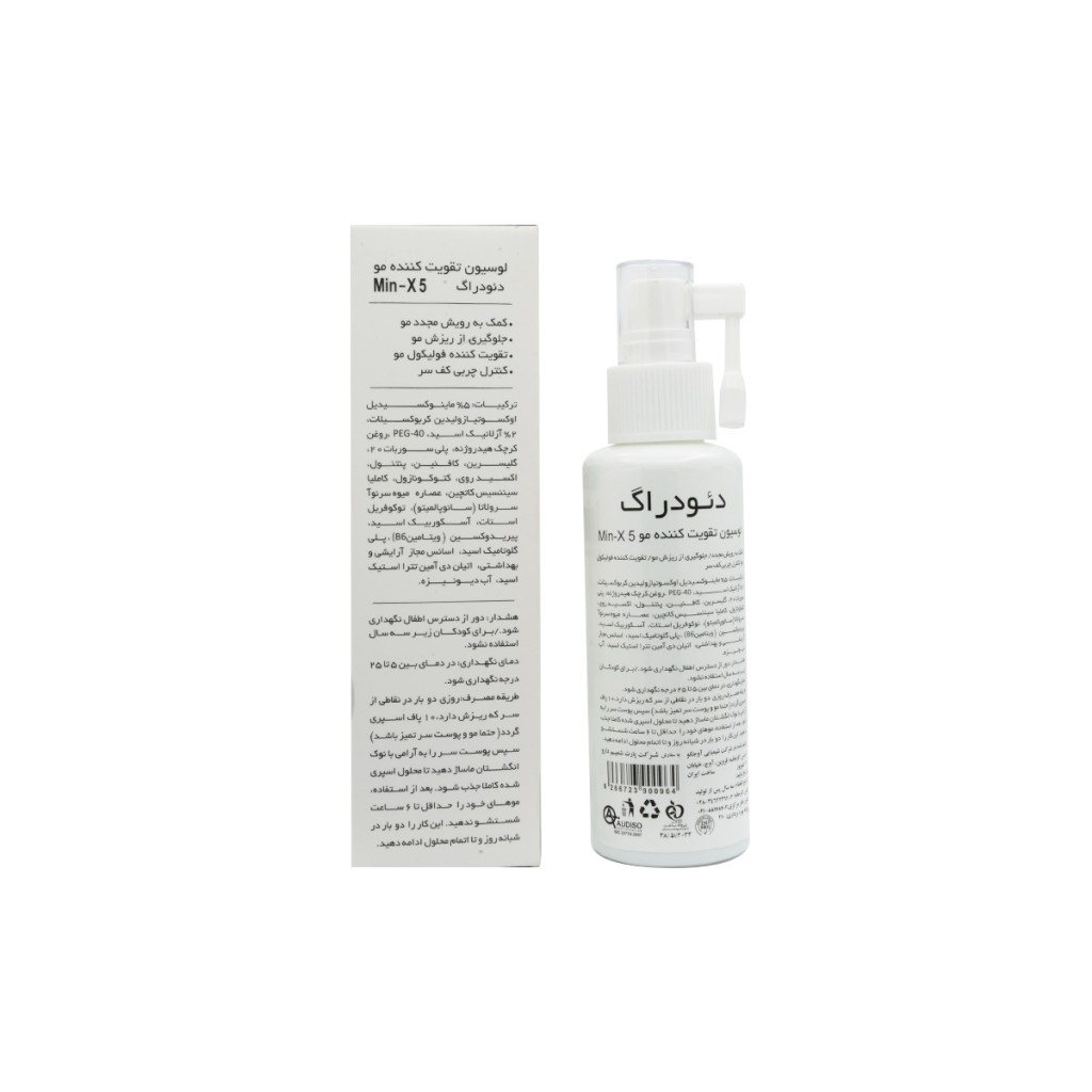 لوسیون تقویت کننده مو دئودراگ (مدل Min-x5)، یکی از محصولات بهداشتی مراقبتی مربوط به مو بوده که به منظور تقویت و جلوگیری از ریزش موی سر مورد استفاده قرار میگیرد. این محصول با فرمولاسیون ویژه خود از ریزش موی آندروژنیک جلوگیری کرده و همچنین به افزایش تعداد موهای در حال رشد هم کمک میکند. این محصول پیاز مو را تقویت کرده و موجب فعالسازی پیاز مو خواهدشد. همچنین جریان خون مویرگی به سمت پیاز مو افزایش یافته، موجب افزیش حجم و پرپشت شدن موها هم میشود.
