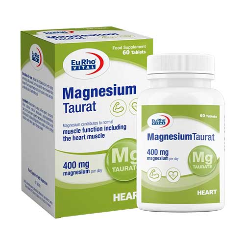 قرص منیزیم تائورات یوروویتال حاوی ۴۰۰ میلیگرم منیزیم عنصری در هر دوز روزانه از نمک منیزیم تائورات است. منیزیم در انقباض و ریلکس شدن طبیعی عضلات، از جمله عضله قلب، نقش اساسی دارد و به عملکرد طبیعی سیستم عصبی، کاهش خستگی و متابولیسم تولید انرژی کمک میکند. تائورین یک اسیدآمینه با اثرات حمایتی بر عضله قلب و تعادل الکترولیتی است و ترکیب آن با منیزیم میتواند به تحمل بهتر و جذب مناسب منیزیم کمک نماید. این مکمل برای حمایت از عملکرد قلبی–عروقی، کاهش گرفتگیهای عضلانی و کمک به آرامش و تنظیم انقباضات عضلانی طراحی شده است.